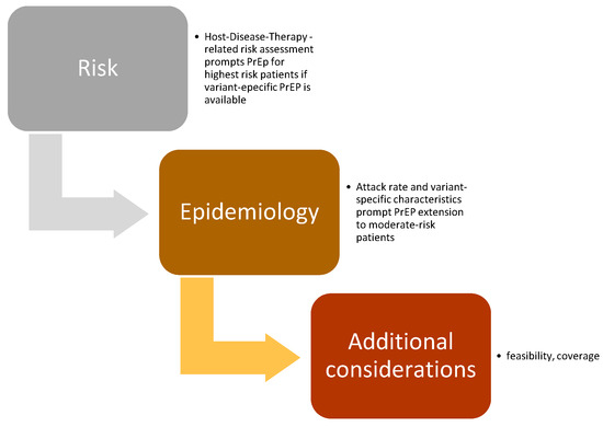 Based on these criteria, we consider PrEP mandatory for allogeneic HCT, CAR-T, and bispecific therapy candidates, regardless of virus epidemiology scenarios. In such cases, COVID-19 presents a serious risk—not just due to the infection itself but also because it may delay essential treatments where timing is critical to patient outcomes. Conversely, in other patient populations at high risk for severe viral disease due to immunological impairment, co-morbidities, and probable poor response to active vaccine immunization, PrEP pharmacology strategies may be adjusted during periods of high epidemic diffusion.