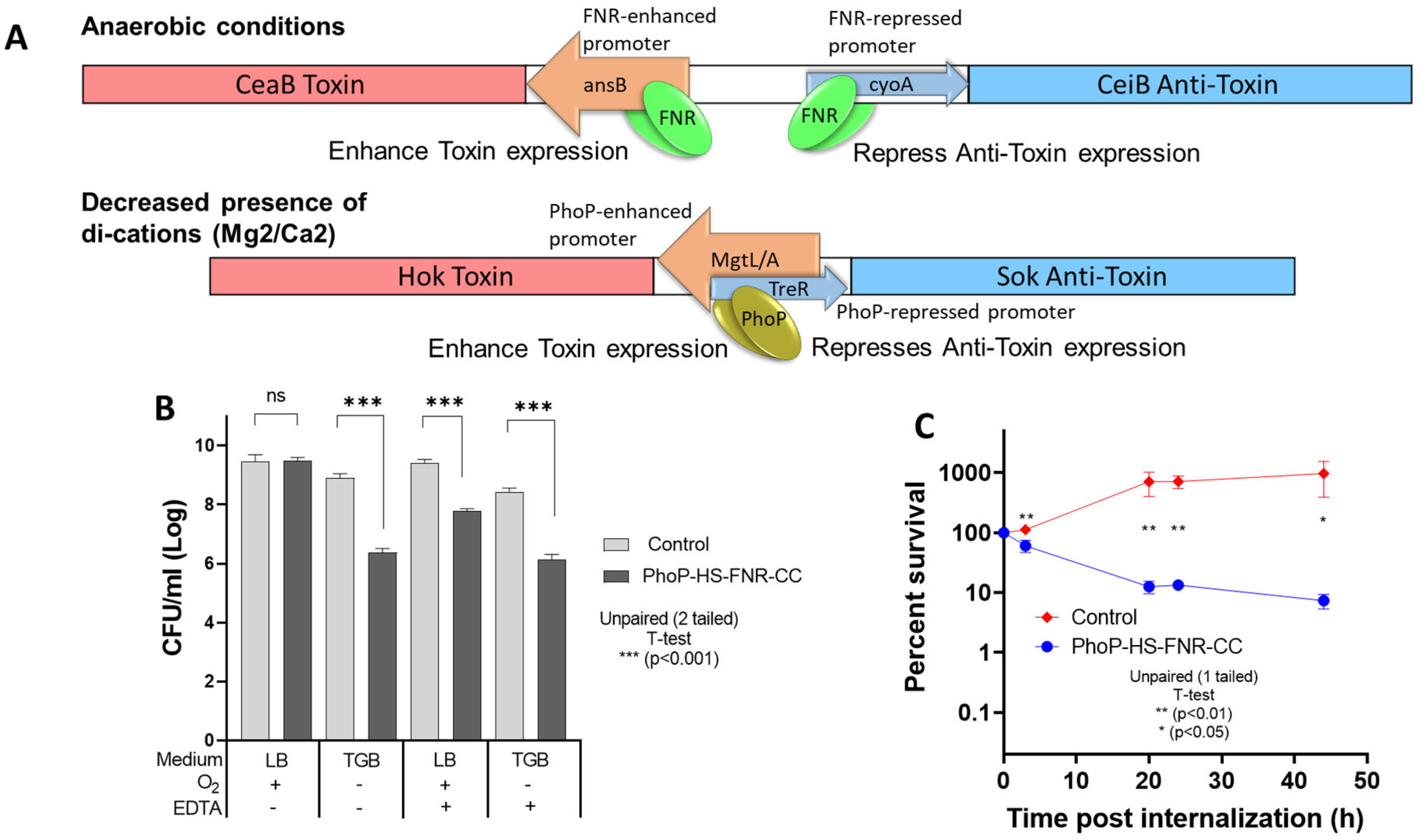 3.2. Survival of PhoP-HS-FNR-CC-Bearing Salmonella Under Restrictive Conditions and Within Macrophages