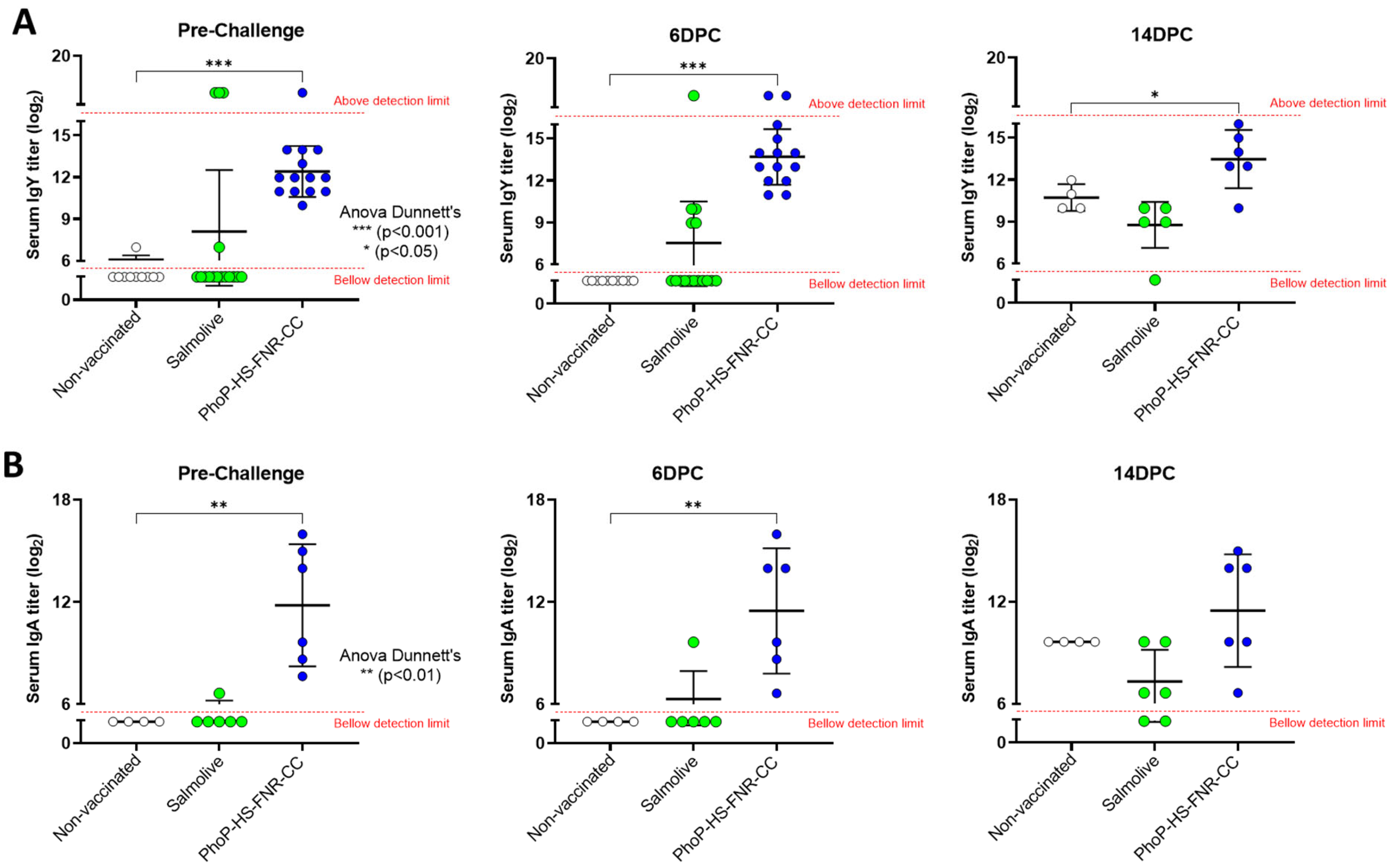 3.5. Antibody Levels Following Immunization of Chickens with PhoP-HS-FNR-CC-Bearing Salmonella