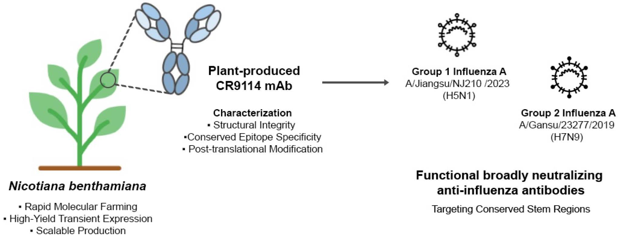 Our study demonstrates that plant-produced CR9114, a broadly neutralizing monoclonal antibody targeting the conserved hemagglutinin (HA) stem, retains functional neutralizing activity against recently isolated avian influenza viruses. The antibody exhibited strong neutralization against A/Jiangsu/NJ210/2023 (H5N1; IC