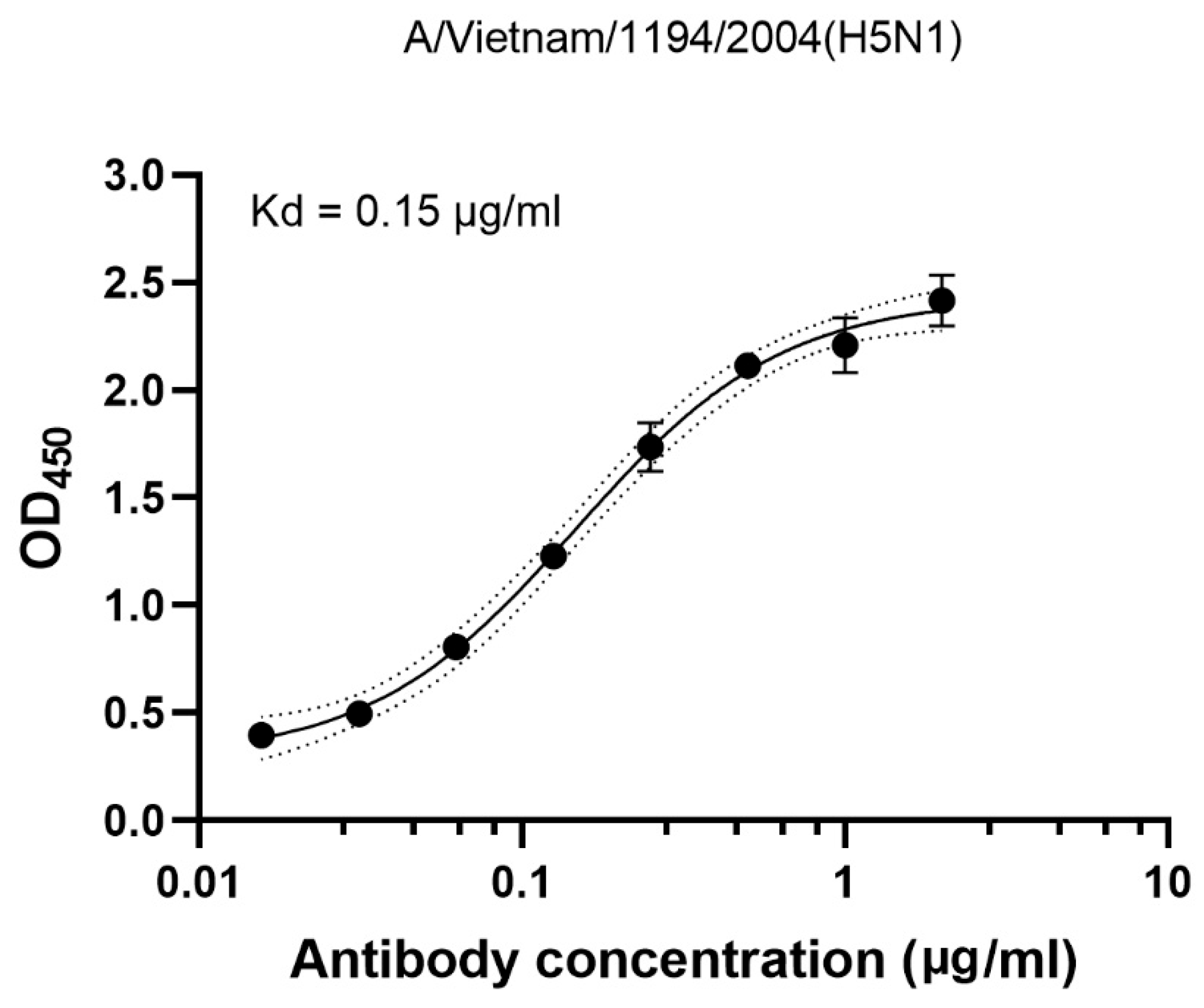 Binding activity of the plant-produced CR9114 antibody to commercial HA antigen was evaluated by ELISA. A 96-well microtiter plate was coated overnight with 2 μg/mL of commercial influenza A HA antigen of A/Vietnam/1194/2004(H5N1) (AcroBiosystem, Newark, DE, USA). Each well of the plate was washed with PBS containing 0.05% Tween-20 (PBS-T) and blocked with 3% skim milk for 2 h. Serial dilutions of the plant-produced CR9114 antibody were then added to the wells and incubated at 37 °C for 2 h, followed by detection using an HRP-conjugated goat anti-human IgG1 gamma chain antibody (1:2000). Enzymatic activity was assessed with 3,3′,5,5′-tetramethylbenzidine (TMB) substrate, and the reaction was stopped with 1 M H2SO4. Absorbance was measured at 450 nm using an EnSight™ multimode plate reader (PerkinElmer, Springfield, IL, USA), operated using the manufacturer’s default acquisition software (no user-accessible software version). All samples were assayed in duplicate. Binding curves were fitted using a four-parameter logistic (4PL) nonlinear regression model in GraphPad Prism. Kd values were calculated from HA-binding ELISA data based on equilibrium binding analysis.