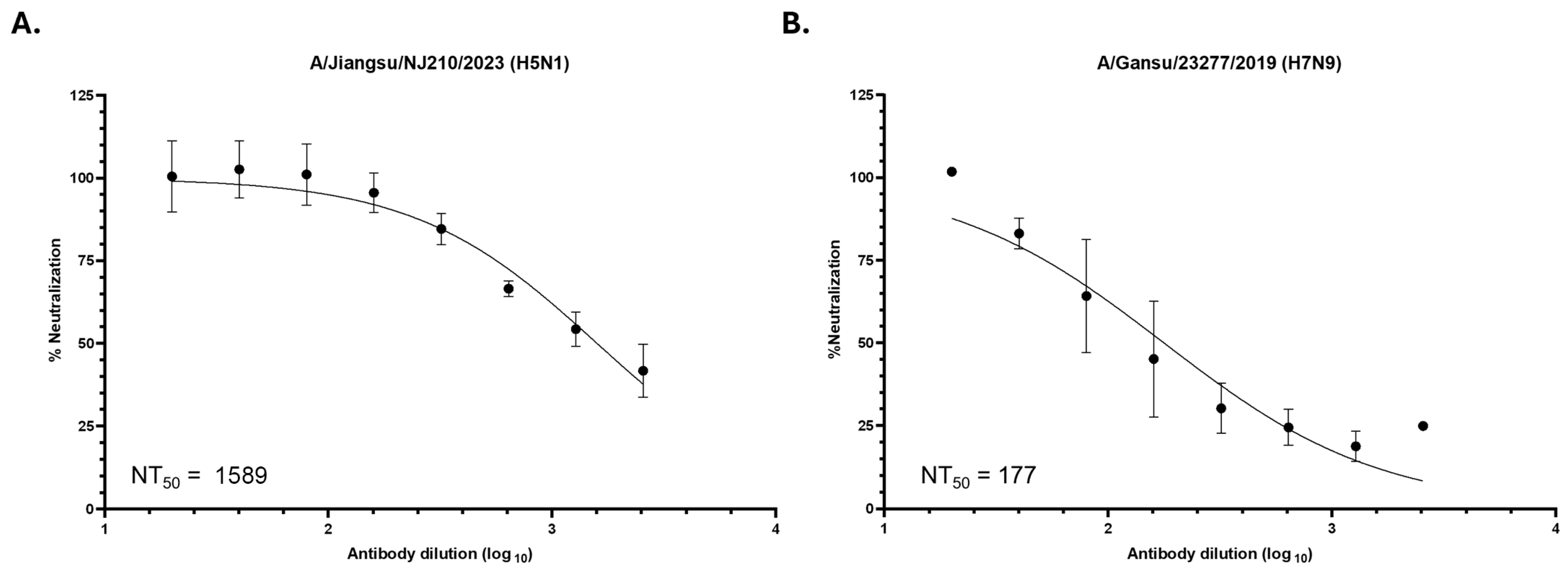17]. These previously reported trends are consistent with our findings, in which stronger activity was observed against the Group 1 H5N1 strain and comparatively lower activity against the Group 2 H7N9 strain. Overall, the neutralization profile of plant-produced CR9114 aligns with the established breadth and subtype-dependent potency described for this antibody.