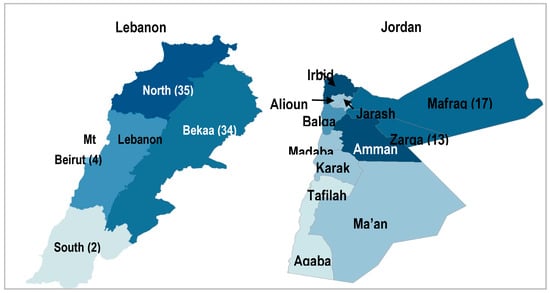 Given the concentration of Syrian refugees and the low cost of visiting many locations due to the countries’ small sizes, a 125 cluster × 12 household design was chosen in Jordan and a 100 cluster × 14 household design was used in Lebanon. Probability proportional to size sampling was used to assign clusters to cadastrals using registration data from UNHCR, assuming that non-registered refugees had similar residence patterns. In Lebanon, the research team was unable to attain permission to conduct the survey in certain security-sensitive areas as planned, which necessitated a re-draw of the 28 clusters that were originally assigned to 22 inaccessible cadastrals. Clusters were re-assigned using probability proportional to size sampling methods based on a revised population residing in accessible areas []. Cluster assignment by governorate in both countries is shown in Figure 1.