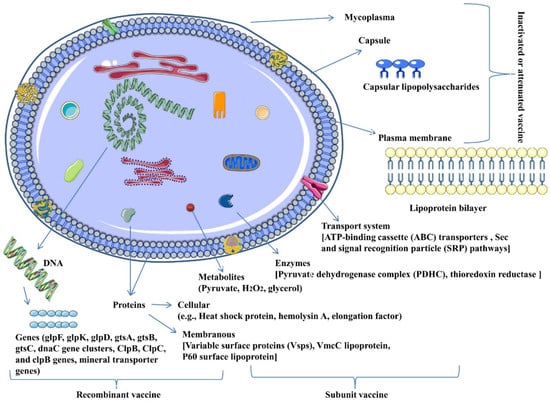 Protein-based vaccines are popular as proteins are convenient to isolate, evaluate, and usually provide an acceptable antigenic and immune response. As previously discussed, outer Mccp membrane proteins of the pyruvate complex PDHA, PDHB, and PDHC have been expressed in E. coli and explored as recombinant protein vaccine candidates. They have been expressed in vivo, show potential antigenicity, provide suitable reactogenicity, and elicit good humoral immune responses [17]. Hence, these entities which are involved in energy metabolism processes may find a role in vaccine development. Membrane protein P48 has been evaluated as a vaccine candidate in Mycoplasma agalactiae [128]. Lipoprotein LppA, which is a 62 kDa major surface protein found in a few members of the mycoides cluster, including Mycoplasma mycoides subsp. capri and Mycoplasma mycoides subsp. mycoides, has been explored as a vaccine candidate [117].