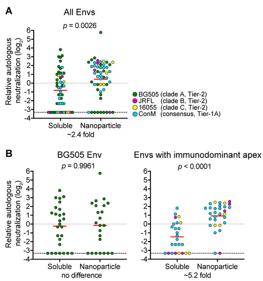 To determine the effect of NP presentation on the induction of HIV-1 NAbs, we performed a meta-analysis on the autologous NAb titers reported in immunogenicity studies that compared the aforementioned native-like Env trimers on NPs to their soluble counterparts in rabbits and non-human primates (Figure 1). When all studies were combined, we found that NAb titers were ~2.4-fold higher for animals immunized with NPs compared to animals immunized with soluble trimers (p = 0.0026; n = 105 animals; Figure 1A). However, we did not find such an improvement for NPs when we compared the autologous NAb titers of BG505 Env immunized animals only (p = 0.9961; n = 50 animals; Figure 1B, left graph). In stark contrast, we found that NPs induced a significant ~5.2-fold higher NAb titer when only Envs with immunodominant NAb epitopes on the trimer apex (i.e., 16055, JRLF and ConM Envs) were taken into account (p < 0.0001; n = 55 animals; Figure 1B, right graph). These analyses suggest that the accessibility of the neutralizing epitope(s) determines whether NPs are useful for increasing the immunogenicity of Env trimers.