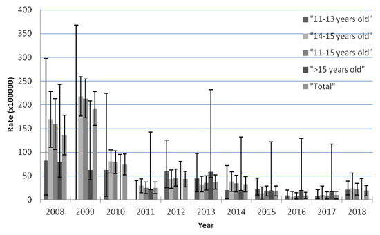 Rates of AEFI reports per 100,000 doses of HPV vaccine administered among the population of interest over the period between 1 January 2008 and 31 December 2018 were calculated. The denominator data utilized to estimate AEFI reporting rates were obtained from the national HPV vaccine coverage survey for ages 11–49 years old. The rates of AEFI reports were also analyzed by age group at the time of vaccination: 11 to 13 years old, 14 to 15 years old, 11 to 15 years old, and <15 years old.