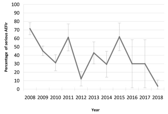 Trend of the percentage of serious AEFI reports in relation with the total AEFI reports in the Valencian Community, Spain (2008–2018).