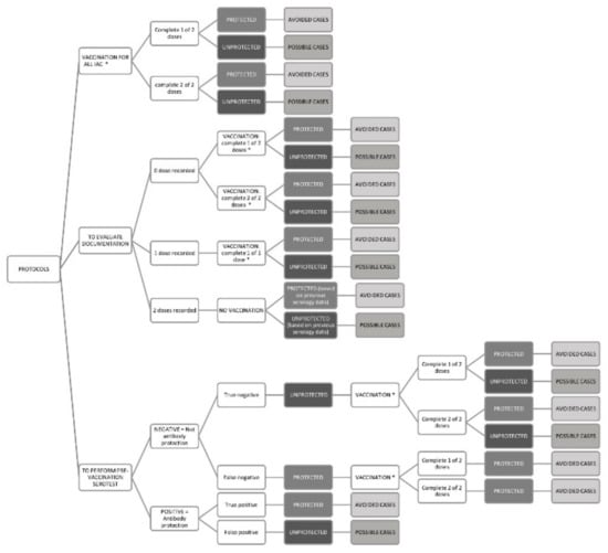 Therefore, for each strategy, based on the decision’s flow chart described above (Figure 1), IAC can be divided into protected (seropositive) and unprotected (seronegative). In fact, even if it seems that high levels of circulating antibodies are important for protection against outbreaks, current data do not give conclusive evidence as to what level of antibodies should be considered protective for each of the VPDs considered, IAC were defined protected when positivity of antibodies levels were serologically determinated and unprotected when negativity of antibodies levels were serologically determinated.