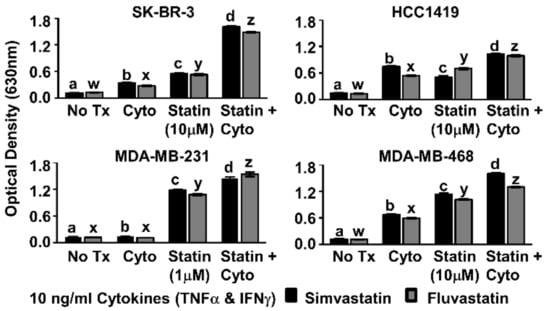 We examined the effects of Th1 cytokines and statin drugs on four human breast cancer cell lines. These included SK-BR-3 and the herceptin-resistant HCC1419 as representative HER-2pos cells, and for comparison, “triple-negative” lines MDA-MB-231 and MDA-MB-468 (Table 1). We restricted our study to ER-negative lines because previous reports identified the ER-positive phenotype as relatively insensitive to statins []. Initial dose–response studies (Figure 1) established optimized cytokine/drug concentrations used throughout the study; 10 ng/mL TNF-α, 10 ng/mL IFN-γ, 1 µM simvastatin or fluvastatin (MDA-MB-231 only), and 10 µM simvastatin or fluvastatin (SK-BR-3, HCC1419, and MDA-MB-468). Although each cell line showed variable sensitivity to single agents, all four cell lines showed significantly (p < 0.001) less reduction of alamar blue dye (indicating decreased metabolism) when treated with statin drugs and Th1 cytokines simultaneously (Figure 2). This was true for both simvastatin and fluvastatin. Therefore, statin drugs and Th1 cytokines displayed at least additive effects for suppressing cellular metabolism of breast cancer lines.