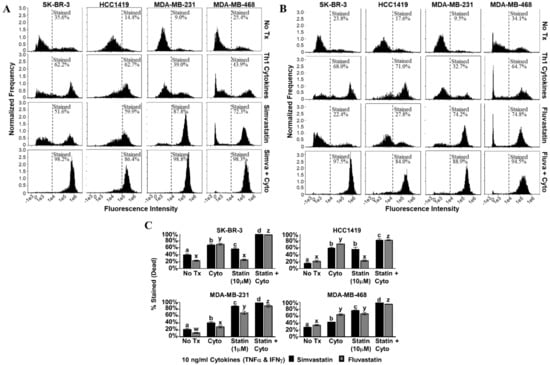 Combination of Th1 cytokines and statin drugs maximize cell death in breast cancer lines. SK-BR-3, HCC1419, MDA-MB-231, and MDA-MB-468 human breast cancer cell lines were cultured with no additives (No Tx), treated with recombinant Th1 cytokines (TNF-α and IFN-γ, 10 ng/mL each), a statin drug (A) Simvastatin or (B) Fluvastatin (1 µM MDA-MB-231; 10 µM remaining cell lines), or the combination of Th1 cytokines and a statin drug (A) “Simva + Cyto” or (B) “Fluva + Cyto”. Flow cytometric results displayed in panels A and B are from one representative experiment. (C) Graphical interpretation of gated flow cytometric results comparing the percentage of stained events between groups: no additives (No Tx), treated with recombinant Th1 cytokines (TNFα and IFNγ, 10 ng/mL each), a statin drug (Simvastatin or Fluvastatin, 1 µM MDA-MB-231; 10 µM remaining cell lines), or the combination of Th1 cytokines and a statin drug (“Statin + Cyto”). Results displayed are from at least three trials +/− SEM. Letter designations represent Tukey’s HSD comparisons: treatments with the same letter designation are not statistically different; when letter designations differ between treatments, the p-value is less than 0.05.
