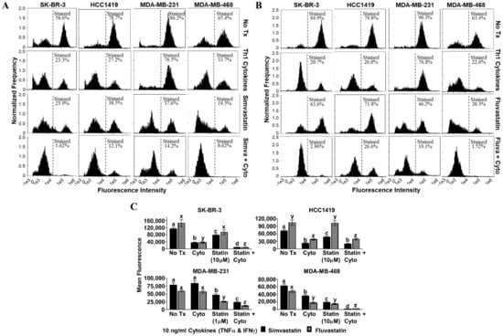 Statin drugs plus Th1 cytokines maximize mitochondrial membrane depolarization as assessed by tetramethylrhodamine ethyl ester (TMRE) staining. SK-BR-3, HCC1419, MDA-MB-231, and MDA-MB-468 human breast cancer cell lines were cultured with no additives (No Tx), treated with recombinant Th1 cytokines (TNF-α and IFN-γ, 10 ng/mL each), a statin drug (A) Simvastatin or (B) Fluvastatin (1 µM MDA-MB-231; 10 µM remaining cell lines), or the combination of Th1 cytokines and a statin drug (A) “Simva + Cyto” or (B) “Fluva + Cyto” for approximately 48 h. Flow cytometric results displayed in panels A and B are from one representative experiment. (C) Statistical analysis of flow cytometry results comparing the mean channel fluorescent intensity between groups: no additives (No Tx), treated with recombinant Th1 cytokines (TNF-α and IFN-γ, 10 ng/mL each), a statin drug (Simvastatin or Fluvastatin, 1 µM MDA-MB-231; 10 µM remaining cell lines), or the combination of Th1 cytokines and a statin drug (“Statin + Cyto”). Results displayed are from at least five trials +/− SEM. Letter designations represent Tukey’s HSD comparisons: treatments with the same letter designation are not statistically different; when letter designations differ between treatments, the p-value is less than 0.05.