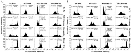 Cells treated with a statin drug and Th1 cytokines demonstrate enhanced activation of caspase 3/7. SK-BR-3, HCC1419, MDA-MB-231, and MDA-MB-468 human breast cancer cell lines were cultured with no additives (No Tx), treated with recombinant Th1 cytokines (TNF-α and IFN-γ, 10 ng/mL each), a statin drug (A) Simvastatin or (B) Fluvastatin (1 µM MDA-MB-231; 10 µM remaining cell lines), or the combination of Th1 cytokines and a statin drug (A) “Simva + Cyto” or (B) “Fluva + Cyto” and stained with CellEvent™ fluorescent caspase substrate. The experiment was repeated at least three times; the displayed flow cytometric results are from one representative experiment. The percentage of stained events, as well as the geometric mean channel fluorescence (in parentheses), is annotated on each histogram.