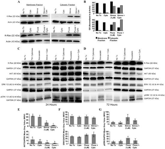 When no significant changes in the levels of downstream effectors of Ras were seen 24 h post-treatment (Figure 7C), lysates were examined following 72 h of treatment (Figure 7D). Treatment with Th1 cytokines alone demonstrated a modest decrease in total AKT (simvastatin series, p = 0.41; fluvastatin series, p = 0.096); there was a significant decrease in total AKT in response to either statin drug (simvastatin, p < 0.001; fluvastatin, p = 0.015); and when the statin drugs were combined with Th1 cytokines, the decrease in total AKT was further enhanced (Th1 cytokines with simvastatin, p < 0.001; Th1 cytokines with fluvastatin, p = 0.005) (Figure 7E). No statistically significant change in the amount of total ERK was observed (Figure 7F), yet while also not achieving statistical significance (simvastatin series, p = 0.232; fluvastatin series, p = 0.311), consistent trends were observed including enhanced phosphorylation with statins alone which were subsequently diminished when combined with Th1 cytokines (Figure 7G).
