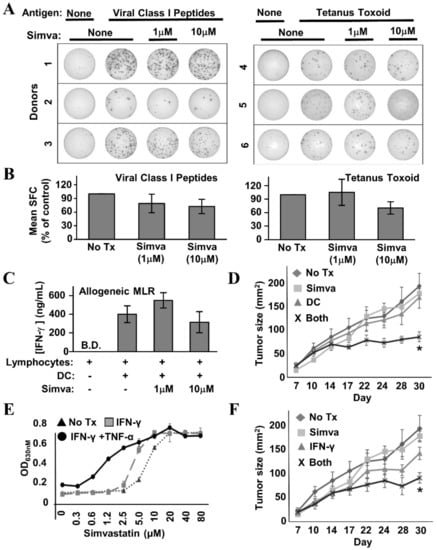 For allogeneic Mixed Lymphocyte Reactions (MLRs), human peripheral blood mononuclear cells were obtained from healthy volunteers via leukapheresis after provision of informed written consent, and in accordance with the principals of the Declaration of Helsinki and National Institutes of Health (NIH) guidelines for human subjects, through protocols approved by the Institutional Review Boards of the Cleveland Clinic (08–957) and Kent State University (18–421), and collected cells were separated via countercurrent centrifugal elutriation into monocyte-rich and lymphocyte-rich fractions []. Co-cultures of allogeneic activated dendritic cells and lymphocytes derived from elutriated cells were set up as described previously [] in the presence or absence of 1–10 µM simvastatin, and IFN-γ assessed in co-culture supernatants 72 h later as described previously []. For EliSpot assays, human Peripheral Blood Mononuclear Cells (PBMCs) were purchased from CTL Corporation (Shaker Heights, OH, USA) and stimulated in vitro with viral peptide ‘plus’ peptide pool (10 µL/well; CTL corp) or Tetanus Toxoid (2 µg/mL; Sigma) in the presence or absence of 1–10 µM simvastatin in 96-well IFN-γ EliSpot assay plates (CTL corp). After 24 h, incubation plates were developed as per manufacturer’s protocol and analyzed as described previously [].