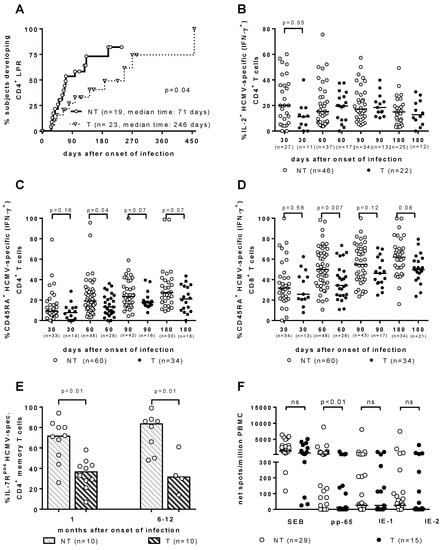 Immune correlates of protection against human cytomegalovirus (HCMV) vertical transmission. (A) CD4+ LPR occurs significantly earlier in NT vs. T women. []. (B) IL-2+ HCMV-specific (IFN-γ+) CD4+ T cells are significantly higher in NT vs. T pregnant women in the first month after infection onset []. (C) CD4+ and (D) CD8+ CD45RA+ HCMV-specific (IFN-γ+) T cells are significantly higher in NT vs. T pregnant women in the second month after infection onset []. (E) IL-7Rpos HCMV-specific CD4+ memory T cells are significantly higher in NT vs. T pregnant women both at 1 and 6–12 months after infection onset []. (F) pp65-specific spots/million peripheral blood mononuclear cells are significantly higher in NT vs. T pregnant women, while no difference in response to IE-1 or IE-2 was observed [].