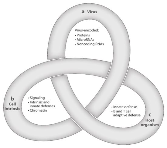 After resolution of PI, HCMV, the prototype of betaherpesviruses, does not disappear from the body, but initiates a lifelong persistence, including states of latent, chronic, and replicative infection. HCMV is strictly species-specific, but displays a broad tropism for different cell types. The often recurring transition from latency to chronic or replicative infection is a complex process that is regulated by three groups of factors—viral, cell-type specific, and related to both the innate and the adaptive host immune responses. The complexity of these interactions has been assimilated to a Gordian knot (Figure 2), in that it is very difficult to explore and untangle []. The transition from the latent to the chronic or replicative state might occur even in healthy people, but does occur much more extensively in immunocompromised (AIDS, transplanted) patients, due to episodes of transitory or prolonged immunodeficiency, often resulting in life-threatening clinical syndromes.