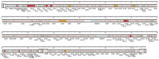 Distribution in the HCMV strain Merlin genome of the genes used for genotyping. The 12 genes (RL5A, RL6, RL12, RL13, UL1, UL9, UL11, UL73, UL74, UL120, UL146, and UL139) used for motif read-matching are in red. Two of these genes (RL13 and UL146) were also used for genotype read-matching (from Reference []).