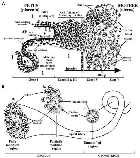 Fetal–maternal interface (FMI) at the end of the first trimester of human pregnancy. (A) Diagram of the FMI showing—(i) a floating villus (FV) which contains macrophages (Hofbauer cells) and fetal blood vessels and is bathed by maternal blood; and (ii) an anchoring villus (AV) resembling a bridge between the fetal and maternal compartments and consisting (zone I) of cytotrophoblasts (CTB) that form cell columns that attach to the uterine wall (zones II and III). CTB invade (zone IV) the uterine wall (decidua and myometrium), thus, accessing the maternal circulation (zone V). Areas of potential HCMV transmission to the placenta are numbered as—1 (direct transmission from maternal blood to CTB); 2 (transmission from macrophages (MØ) and decidual granulocytes (DGLs) to invading CTB); and 3 (transmission from maternal blood cells to fetal endothelial cells and CTB). (B) Diagram of a uterine spiral artery, in which endovascular CTB invasion is in progress—(a) a fully modified region; (b) a partially modified region in the decidua as a result of CTB invasiveness; and (c) an unmodified region of the spiral vessel in the myometrium are shown [].