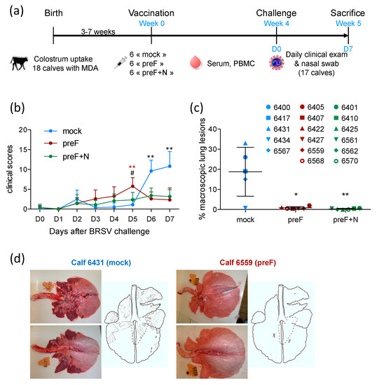 Vaccination with preF or preF+N provides strong clinical protection against BRSV challenge. (a) Study design. D0 is the day of challenge (4 weeks after a single vaccination). Calves were sacrificed 7 days after challenge (D7), 5 weeks after vaccination. (b) Monitoring of clinical protection against BRSV infection of vaccinated calves (3 groups of 5–6 animals). The clinical scores were calculated as described in [30] based on daily clinical examinations of calves. (c) Macroscopic lung lesions are expressed as a % of total lung surface calculated from photographs of the lungs made post mortem (d) (ImageJ v1.52a free software, https://imagej.nih.gov/ij/index.html). Each spot represents one calf (controls/blue; preF/red; preF+N/green). Mean values with standard error of the mean are indicated by the black line. (d) Ventral and dorsal aspects of the lung were photographed. Ventral and dorsal lesions were also drawn onto a lung scheme. Statistics are Mann–Whitney two-tailed (b,c), day by day comparison of groups (b), * indicates significant difference between controls and vaccinated calves (black stars: mock versus both preF and preF+N, red stars: mock versus preF), # indicates a significant difference between the two vaccinated groups (preF versus preF+N). (* p < 0.05, ** p < 0.01).