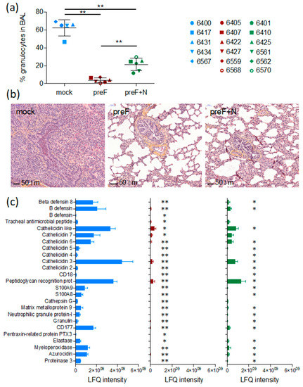 Safety and efficacy of preF vaccines according to their inflammation profiles in BAL and lungs. (a) % of granulocytes counted in BAL upon May–Grünwald–Giemsa staining. Each spot represents one calf (controls/blue; preF/red; preF+N/green). Mean values with standard error of the mean are indicated by black line. Statistics are Mann–Whitney two-tailed values (* p < 0.05, ** p < 0.01). (b) Biopsies were taken from the cranial lobe, and lung sections were stained with H&E. (c) Broncho-alveolar lavage (BAL) supernatants from vaccinated calves and controls, obtained on D7 after BRSV challenge, were analysed by liquid chromatography coupled to tandem mass spectrometry (the shotgun method, LC-MS/MS, Orbitrap, Thermo Scientific, Bremen, Germany). Proteins were identified, and a total label-free intensity analysis was performed using MaxQuant 1.5.1.2 software. Twenty-five proteins were selected based on being related to neutrophils, and the relative quantities of these are presented as label-free quantification (LFQ) intensities. Statistical tests are Wilcoxon, with corrected p-values (Benjamini–Hochberg). Comparisons between groups were done for each of the 25 proteins (mock versus preF or mock versus preF+N). (* p<0.05, ** p<0.01).