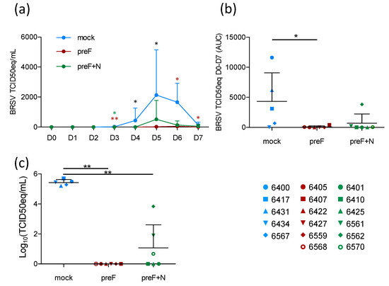 Thus, vaccination with preF and preF+N induced highly significant protection against BRSV replication both in the upper respiratory tract and the lower respiratory tract. Importantly, virus replication (estimated by area under the curve (AUC)) was nearly abrogated in preF- and preF+N-vaccinated calves.