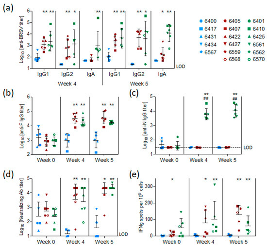 Systemic antibody and T cell responses elicited by pre-F or pre-F and N. Calves were vaccinated IM with preF or preF+N in ISA61 adjuvant or mock (ISA61 alone) and were challenged 4 weeks later with BRSV. (a) BRSV-specific IgG1, IgG2, IgA titers in sera at weeks 4 and 5 after vaccination. (b) pre-F-specific Ab titers in sera at weeks 0, 4, and 5 after vaccination. (c) N-specific Ab titers in sera at weeks 0, 4, and 5 after vaccination. (d) BRSV-neutralizing Ab titers in sera at weeks 0, 4, and 5 after vaccination. (e) IFNγ BRSV-specific T cells among PBMC depleted from γδ+ T-cells at weeks 4 and 5 after vaccination counted by ELISPOT. Each spot represents one calf (controls/blue; preF/red; preF+N/green). Mean values with standard error of the mean are indicated by the black line. Statistical analysis was performed by the non-parametric test Mann–Whitney, two-tailed p value. * indicates a significant difference between controls and the preF- or preF+N-vaccinated calves, # indicates a significant difference between the two vaccinated groups (preF and preF+N). (* # p < 0.05, ** ## p < 0.01). Limits of detection are log10 0.5 for N-specific IgG, log10 1.4 for BRSV-specific IgG2, log10 1.7 for BRSV-specific IgA and IgG1, and log10 1.0 for BRSV neutralising antibodies.