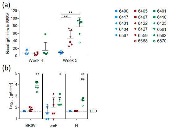 Mucosal antibody responses elicited by pre-F or pre-F and N. Calves were vaccinated IM with preF or preF+N in ISA61 adjuvant or mock (ISA61 alone) and were challenged 4 weeks later with BRSV. (a) BRSV-specific IgA in nasal secretions sampled on the day of challenge (week 4) and one week after challenge (week 5). (b) BRSV-, preF-, and N-specific IgA in BAL supernatant was collected post-mortem (week 5). Each spot represents one calf (controls/blue; preF/red; preF+N/green). Mean values with standard error of the mean are indicated by the black line. Statistical analysis was performed by the non-parametric test Mann–Whitney, two-tailed p value. * indicates a significant difference between controls and the preF- or preF+N-vaccinated calves, # indicates a significant difference between the two vaccinated groups (preF and preF+N). (* # p < 0.05, ** ## p < 0.01).