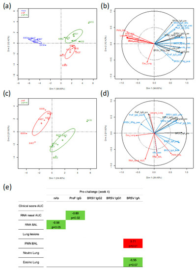 Principal component analysis (PCA) and correlation analysis of the clinical, virological, and immunological response data of the calves vaccinated with preF, preF+N or mock-vaccinated. Calves were vaccinated IM with preF or preF+N in ISA61 adjuvant or mock (ISA61 alone) and were challenged 4 weeks later with BRSV and sacrificed one week after challenge. (a) The PCA plot of the clinical, virological, and immunological response data (21 PCA variables) of vaccinated and non-vaccinated calves is depicted, with each calf represented as a dot plus ID number in a specific color according to its group assignment: Dim1 explained 54.65% of the total variation of the data between calves, and Dim 2 explained a further 12.42% of the variation. The vaccination regimen is indicated by a distinct color (blue for controls, red for preF, and green for preF+N). (b) 357 individual input values were loaded (21 parameters measured on 17 calves, see Materials and methods), and the most relevant ones are indicated on the figure for clarity (R > 0.5). In red the virological, inflammatory & clinical scores; in black the immunological parameters measured at week 4 (pre-challenge), and in blue the immunological parameters measured at week 5 (post-mortem). (c) Same as (a) but considering only the 252 individual data collected from the 12 vaccinated calves (preF and preF+N). (d) Same as (b) but considering only the 252 individual data collected from the 12 vaccinated calves (preF and preF+N). (e) Spearman Correlation analyses, two-tailed, between the immune response data collected pre-challenge (week 4) versus the clinical and virological data of the 12 vaccinated calves. Only significant/nearly significant correlations are shown, in green where negative and in red where positive.