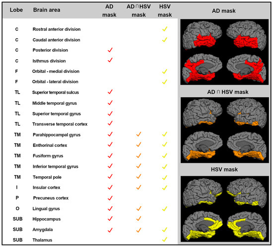 Ad-hoc masks of brain areas considered in the statistical analyses. List of all the brain areas included in each mask: in red color, brain regions that are target areas in the mild stages of AD pathology (AD mask); in yellow color, cortical areas that are the target for HSV-1 encephalitis (HSV-mask); and in orange color, the areas commonly shared by AD mask and HSV-mask (AD∩HSV-1-mask). AD: Alzheimer disease; C: cingulum; F: frontal; TL: temporal lobe, lateral aspect; TM: temporal lobe, medial aspect; I: insula; P: parietal; O: occipital; SUB: subcortical volumes.