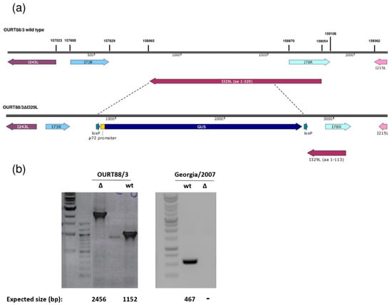 Deletion of the I329L gene from the OURT88/3 and Georgia 2007/1 genomes. (a) The position and direction of the I329L gene and neighbouring genes on the wild-type OURT88/3 genome are shown on the top panel. Arrows indicate the direction in which the genes are read. The bottom panel shows details of the construction of the I329L gene deletion. The β-Glucoronidase (GUS) gene under control of the African swine fever virus (ASFV) B646L gene promoter and flanked by loxP sites was used to replace the I329L gene, excluding the portion encoding residues 1 to 113. This fragment was retained to avoid disrupting the overlapping I78R gene, which is read from the opposite strand. (b) Analysis of genomic viral DNA by PCR. Viral DNA was extracted from wild-type (wt) and delta I329L (Δ) viruses. Specific fragments were amplified by PCR and the products were analysed by agarose gel electrophoresis. For OURT88/3, the fragments encompassing the flanking regions of the I329L deletion are shown and the expected fragment sizes are indicated below each lane. For Georgia 2007/1, a fragment within the deletion was obtained for the wt but not for the deletion mutant virus as expected.
