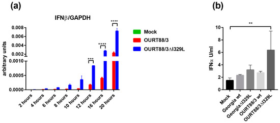Expression of type I interferon (IFN) in macrophages infected with wild-type and I329L deletion mutants. Panel (a) shows IFN-β transcripts relative to GAPDH. Pig alveolar macrophages (PAMs) were mock infected or infected with wild-type OURT88/3 or OURT88/3Δ329L viruses at an multiplicity of infection (MOI) of 1. At different times post-infection (x-axis), RNA was extracted and copy numbers for IFN-β and GADPH were quantified by quantitative real time PCR (qPCR) (y-axis). Panel (b) shows IFN-α detected in supernatants from porcine bone marrow cell cultures infected with wild-type or I329L gene-deleted ASFV isolates. PBM cells were mock infected or infected with wild-type Georgia or OURT88/3 isolates and I329L gene deletions from these viruses as indicated on the x-axis at an MOI of 1. At 16 h, post-infection levels of IFN-α were assayed and are shown as units per/mL on the y axis. The results shown are averages from infections of cells from 3 different outbred pigs. Asterisks indicate statistically significant differences between the indicated samples (** p ≤ 0.01; *** p ≤ 0.001; **** p ≤ 0.0001).