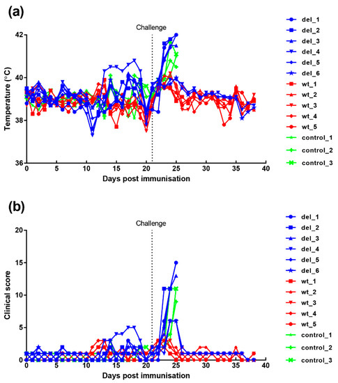 Clinical signs post-immunisation and challenge (Figure 4) show that, after immunisation, one pig, (del_4) from the group immunised with the OURT88/3Δ329L deletion virus, developed a temperature of between 40.3 and 40.8 °C between days 13 and 19. This coincided with the appearance of a swelling at the vaccination site. After anti-inflammatory and antibiotic treatment, the swelling reduced and temperature decreased. Pig del_6 had a reduced appetite on 2 days. Apart from this, no further signs were observed in this group before challenge.
