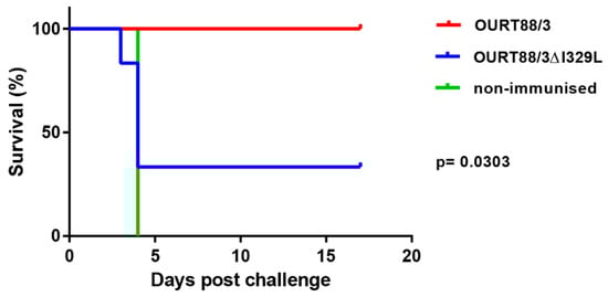 Survival of pigs immunised with OURT88/3 or OURT88/3ΔI329L or control pigs after challenge with virulent virus. The percentage of pigs that survive challenge is shown on the y-axis and days post-challenge on the x-axis. Pigs immunised with OURT88/3 are shown in red, with OURT88/3ΔI329L in blue. Control pigs are shown in green.