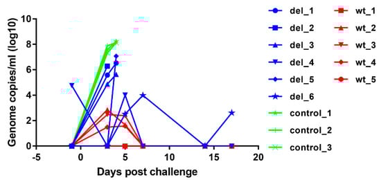 ASFV genome copies detected in blood from pigs immunised with OURT88/3 or OURT88/3ΔI329L or control pigs at different times post-challenge with virulent virus. ASFV genome copies per ml are shown on the y-axis and days post-challenge on the x-axis. The results for pigs immunised with OURT88/3 are shown in red (wt_1–5), with OURT88/3ΔI329L in blue (del_1–6) and control pigs in green (control_1–3).