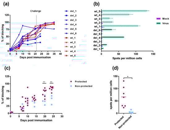 Immune responses in pigs immunised with OURT88/3 and OURT88/3ΔI329L. Panel (a) shows anti-ASFV antibodies detected by a blocking ELISA at different days post-immunisation. The y-axis shows the percentage of blocking, and the x-axis shows days post-immunisation. The results for pigs immunised with OURT88/3 are shown in red (wt_1–5), with OURT88/3ΔI329L in blue (del_1–6). Panel (c) compares antibody response in pigs that survived challenge (protected, magenta) with those that did not survive (non-protected blue). Panel (b) shows the numbers of IFN-γ-producing cells detected by ELIspot assay following the stimulation of lymphocytes with ASFV. The x-axis shows IFN-γ-producing cells (spots) per million of cells detected, and the y-axis shows the source of samples. The results from mock-treated (purple) and ASFV-stimulated lymphocytes (green) are shown. Panel (d) compares numbers of IFN-γ-producing cells detected in protected versus non-protected pigs. Asterisks indicate statistically significant differences between groups (* p ≤ 0.05; ** p ≤ 0.01).