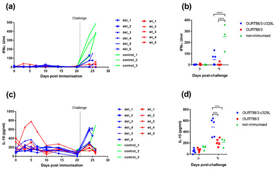 Detection of IL-10 and IFN-α in sera from pigs after immunisation and challenge. Panel (a) shows IFN-α and panel (c) IL-10 detected in serum at different days post-immunisation. The y-axis shows the amount detected in Units per ml, and the x-axis shows the days post-immunisation. The results for pigs immunised with OURT88/3 are shown in red (wt_1–5), with OURT88/3ΔI329L in blue (del_1–6) and control pigs in green (control_1–3). Panels (b,d) show the results post-challenge analysed to determine statistical differences between groups. Asterisks indicate statistically significant differences between groups (*** p ≤ 0.001; **** p ≤ 0.0001).