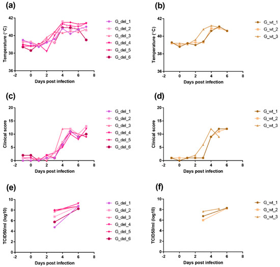 Clinical scores and temperatures of pigs following infection with GeorgiaΔI329L or Georgia 2007/1 wild type. The panels (a,b) show temperatures and panels (c,d) clinical scores following infection of pigs with GeorgiaΔI329L (G_del_1 to 6) or Georgia wild type (G_wt_1 to 3). The panels (e,f) show TCID50 per ml of blood (y-axis) at different days post-infection.