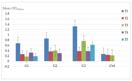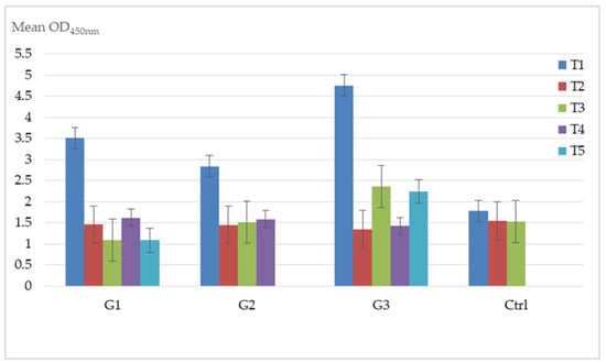 EHVI: Mean ELISA optical density (OD) values recorded by intergroup and between groups. Legend: T5 G1–G3 (t = −2.8396; p = 0.0296). Error bars: Standard Error of the Mean.