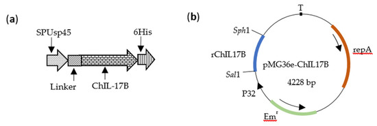 Schematic diagram of the construction of the rChIL-17B gene and pMG36e-ChIL17B. (a) The rChIL-17B gene. The signal peptide sequence SPUsp45 and the linker gene fragment (GGTTCTGGTGGTTCTGGTTCTGGTGGTTCT) were used to promote the ChIL-17B protein’s secretion from the cell wall and to make the ChIL-17B function naturally. (b) The recombinant plasmid pMG36e-ChIL17B. The rChIL17B was inserted into the multiple cloning sites between restriction endonucleases Sph1 and Sal1.