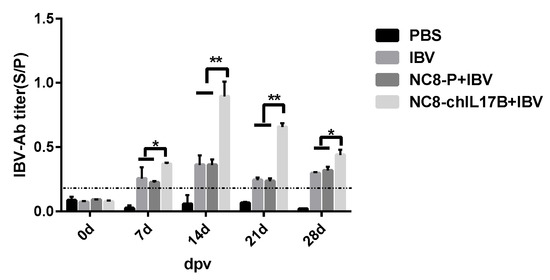 On the 7th, 14th, 21st, and 28th dpv, the IBV-specific antibodies in the serum were evaluated by indirect ELISA. Starting from the 7th dpv, the sample vs positive control (S/P) values of the IBV-specific antibodies in the IBV, NC8-P + IBV, and NC8-ChIL17B + IBV groups were >0.2, which means that the IBV vaccine induced effective antibodies. Additionally, throughout the 28-day vaccination period, the IBV-specific antibody titers in the NC8-ChIL17B + IBV group were significantly higher than those in the IBV and NC8-P + IBV groups: p < 0.05 on the 7th and 28th dpv, and p < 0.01 on the 14th and 21st dpv (Figure 3). Furthermore, on the 14th dpv, the IBV-specific antibody level reached the highest titers.