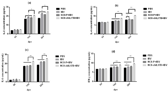 As shown in Figure 4, at 0 dpv, the concentrations of IL-2, IL-4, IL-6, and IFN-γ showed no differences across the four groups. The concentration of IL-2 (Figure 4a) in the NC8-ChIL17B-IBV group was significantly higher than in the IBV and NC8-P + IBV groups (p < 0.05) on the 14th and 28th dpv. Furthermore, the concentration of IL-2 in the IBV and NC8-P + IBV groups was also significantly higher than in the PBS control group: p < 0.05 on the 14th dpv, and p < 0.01 on the 28th dpv. Moreover, the concentrations of IL-4 (Figure 4b), IL-6 (Figure 4c), and IFN-γ (Figure 4d) in the NC8-ChIL17B group were very significantly higher compared to that from the IBV, NC8-P + IBV, and PBS groups (p < 0.01) on the 14th and 28th dpv (p < 0.01).