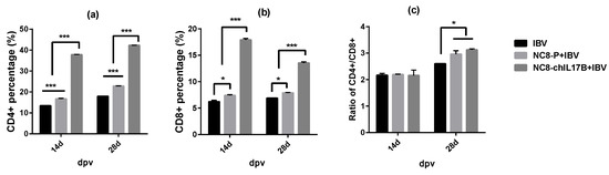 The CD4+ and CD8+ T-cell counts in the peripheral blood were determined using flow cytometry (FCM). On the 14th and 28th dpv, a very significant upregulation of CD4+ T cells (Figure 5a) and CD8+ T cells (Figure 5b) was observed in the chickens from the NC8-ChIL17B + IBV group compared to those in the IBV and NC8-P + IBV groups (p < 0.001). Additionally, the CD4+ and CD8+ T cells in the NC8-P + IBV group were significantly increased in comparison to the IBV group. The CD4+/CD8+ ratio in all three groups was >2.0, and on the 28th dpv the ratio in the NC8-ChIL17B + IBV group was >3.0, which was significantly higher than that in the IBV group (p < 0.05) but not significantly different in comparison to the NC8-P + IBV group.