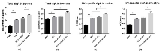 The concentrations (μg/mL) of total sIgA in the trachea and intestine lavage solutions were detected using sandwich ELISA. Additionally, the IBV-specific sIgA titers were detected by indirect ELISA. In the tracheas, both the total sIgA and the IBV-specific sIgA in the NC8-ChIL17B + IBV group were significantly higher than in the IBV and NC8-P + IBV control groups (Figure 6a,c), p < 0.05. In the intestines, both the total sIgA and the IBV-specific sIgA of the NC8-ChIL17B + IBV group were significantly higher than in the control groups: p < 0.01 in the tracheas and p < 0.05 in the intestines (Figure 6b,d). Furthermore, in the IBV and NC8-P + IBV groups, the concentrations of total sIgA and IBV-specific sIgA did not significantly differ in either the tracheas or the intestines. Moreover, the concentration of total sIgA was higher in the tracheas than that in the intestines.