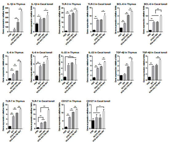 The mRNA levels of the IL-1β, Toll-like receptor (TLR-3), B-cell CLL/lymphoma 6 (BCL-6), IL-6, transforming growth factor-β 4 (TGF-β4), TLR-7, cluster of differentiation 127 (CD127), and IL-22 genes in the thymus and cecal tonsils from the experimental chickens were analyzed by qRT-PCR. As shown in Figure 7, the expression of the cytokine genes, IL-1β and IL-6, and the BCL-6 gene, which participates in regulating cell and/or humoral immunity, was significantly upregulated in the NC8-ChIL17B + IBV group compared to the PBS, IBV, and NC8-P + IBV control groups, either p < 0.05 or p < 0.01. The expression of IL-22 is important for mucosal barriers. In the thymus, the expression IL-22 of the NC8-ChIL17B + IBV, NC8-P + IBV, and IBV groups was significantly upregulated compared to the PBS control group (p < 0.05), but there were no significant differences between the three groups. In the cecal tonsils, the expression of IL-22 in the NC8-ChIL17B + IBV group was significantly upregulated compared to the control groups (p < 0.05). The expression levels of both TLR-3 and TLR-7 in the thymus and the cecal tonsils, which are involved in innate immunity, were significantly upregulated in the NC8-ChIL17B + IBV group compared to the control groups, either p < 0.05 or p < 0.01. The expression of the TGF-β4 gene, one of the cytokines that participates in maintaining immune homeostasis, was also significantly upregulated compared to the three control groups: p < 0.05 in the thymus and p < 0.01 in the cecal tonsils. The expression of CD127, the marker of memory CD8+ T cells, was significantly upregulated compared to the control groups: p < 0.01 in the thymus and p < 0.05 in the cecal tonsils, and the gene expression fold-change in the thymus was higher than in the cecal tonsils.