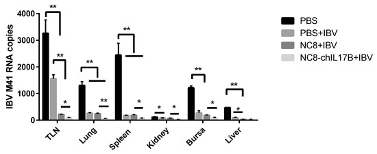 In this study, chickens were challenged with the virulent IBV M41 strain and kept for 10 days to observe their clinical symptoms. Under virulent IBV strain challenge, the chickens in the PBS group presented apparent cough and asthma in the morning. However, there were no apparent symptoms observed in the chickens of the IBV, NC8-P + IBV, or NC8-ChIL17B + IBV groups. To evaluate the resistance effect of the IBV H120 vaccine to the virulent M41 strain, the IBV M41 genome copies in the tissues (i.e., tracheas, lungs, spleens, kidneys, bursae, and livers) on the 10th day post-challenge (dpc) were analyzed by absolute qPCR. As shown in Figure 8, the mean IBV M41 copies in the IBV-immunized groups, namely IBV, NC8-P + IBV, and NC8-ChIL17B + IBV, were very significantly reduced compared to those of the PBS group (p < 0.01). The mean IBV M41 copies in the tracheas, lungs, spleens, kidneys, and bursae from the NC8-ChIL17B + IBV group were very significantly or significantly lower compared to the NC8-P + IBV control group: p < 0.01 in the lungs and p < 0.05 in the tracheas, spleens, kidneys, and bursae.