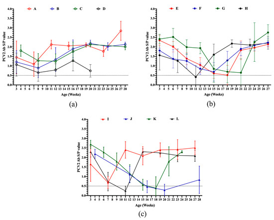 Serodynamic profile of porcine circovirus type 2 (PCV2) measured by BioCheck ELISA in different aged pigs born from different sow immunization programs against PCV2 from different farms. (a) sows without PCV2 vaccination (Farms A, B, C, and D); (b) sows with mass PCV2 vaccination (Farms E, F, G, and H); (c) PCV2 vaccination in sows at 2-4 weeks pre-farrowing (Farms I, J, K, and L).