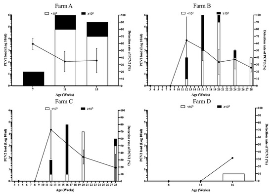Viremia loads (line graph, left Y axis) and detection rate (bar chart, right Y axis) of porcine circovirus type 2 (PCV2) in pigs born from sows without PCV2 vaccination group, Farms A, B, C, and D. The error bars show the standard deviation (SD) of positive samples.