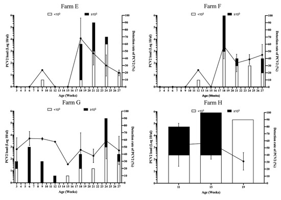 Viremia loads (line graph, left Y axis) and detection rate (bar chart, right Y axis) of porcine circovirus type 2 (PCV2) in pigs born from the sow mass PCV2 vaccination group, Farms E, F, G, and H. The error bars show the standard deviation (SD) of positive samples.