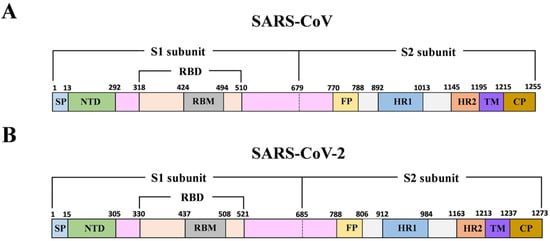 Coronavirus (CoV) belongs to the family of Coronaviridae, and it is an enveloped, positive-sense single-stranded RNA virus. Both SARS-CoV-2 and SARS-CoV fit into the subgenus of Sarbecovirus within the genus of Betacoronavirus (Beta-CoV), based on phylogenetic tree analysis [,,]. The viral genome, approximately 30 kb in size, encodes four structural proteins including the spike (S), envelope (E), membrane (M), and nucleocapsid (N) proteins. The S protein is composed of an ectodomain, a transmembrane domain (TM), and a short cytoplasmic tail region (CP) (Figure 1). The S protein forms homotrimers on the viral membrane surface. The ectodomain of S protein is composed of two subunits (S1 and S2) which are responsible for host cell receptor engagement and membrane fusion, respectively. The S1 subunit contains an NH2-terminal domain (NTD) and the carboxyl-terminal domain (CTD), which is also called the receptor-binding domain (RBD). Coronaviruses may use both domains to interact with a variety of host cell receptors for cell entry. For instance, both SARS-CoV and SARS-CoV-2 use the RBD to specifically bind angiotensin-converting enzyme 2 (ACE2) on host cells for virus entry [,,]. Molecular modeling has suggested that the SARS-CoV-2 receptor-binding domain (RBD) has a stronger binding affinity to ACE2 []. Middle East Respiratory Syndrome Coronavirus (MERS-CoV) uses its RBD to bind to host cell receptor dipeptidyl peptidase 4 (DPP4) []. Some other members, such as porcine epidemic diarrhea virus (PEDV), employ the NTD to interact with a sugar moiety on the host cell membrane for binding and entry []. SARS-CoV receptor (ACE2) binding to RBD of the S1 subunit induces subsequent conformational changes of the S2 subunit, which leads to the fusion of the cell and the virus membranes [,]. The S2 subunit contains two heptad repeat domains (HR1 and HR2) that play a critical role in SARS-CoV membrane fusion with target cells.