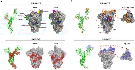 Localization of linear (A) and discontinuous (B) B-cell epitopes of the SARS-CoV-2 and SARS-CoV S proteins. (A) The predicted linear B-cell epitopes of SARS-CoV-2 (top) and the known linear B-cell epitopes of SARS-CoV (bottom) in the monomeric (left, ribbon model) and on the trimeric (middle and right, surface model) S proteins. Eight predicted epitopes of the SARS-CoV-2 S protein are shown as salmon in the monomeric S protein or distinct colors on the trimeric S protein surface (1: salmon; 2: green; 3: red; 4: blue; 5: yellow; 6: magenta; 7: cyan; 8: orange). The epitopes of the SARS-CoV S protein are shown as red in the monomeric and trimeric S protein surfaces. (B) The predicted discontinuous B-cell epitopes of SARS-CoV-2 (top) and the known discontinuous B-cell epitopes (Epitope ID: 77442, 77444, and 910052) of SARS-CoV (bottom) in the monomeric (left, ribbon model) and on the trimeric (middle and right, surface model) S proteins. The epitopes of SARS-CoV-2 are shown as orange in monomer and distinct colors on the trimeric S protein surface (S1–1: red; S1–2: orange; S1–3: blue; S2–1: yellow; S2–2: magenta; S2–3: light blue; S2–4: cyan; S2–5: salmon). The epitopes of the SARS-CoV S protein are shown as blue in the monomeric S protein and on the trimeric S protein surface. The boxes with red dashed lines indicate the membrane-distal termini of both trimeric S proteins and the top views are on the right. Note: Three-dimensional (3D) structure models of the SARS-CoV-2 S protein (PDB ID: 6VYB) and SARS-CoV S protein (PDB ID: 6ACD) were retrieved from the PDB database.